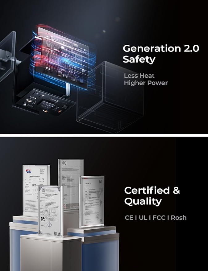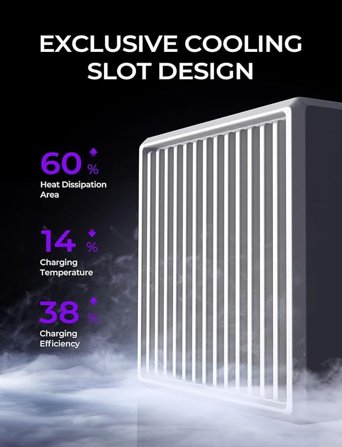 - COOLING DESIGN: The grid-shaped design increases the effective heat dissipation area by 60%, and the temperature is 14% lower than that of traditional chargers at maximum power, making charging safer.