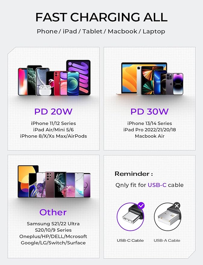 - Gift with USB C to Lightning and USB C to USB C Cable: The Apple MFI certified lightning cable can provide 30W PD super fast charging for iPhone 14-13-12 serise, and also can fast charge iPhone XR-X-8-7-6 serise and Air Pods. And another USB C to USB C cable is USB-IF certified PD60W and compatible with Macbook Pro/Mini, iPad 2023/22/21/19 Pro, Samsung S23/22/21/20, Pixel, Oneplus and all USB C devices.