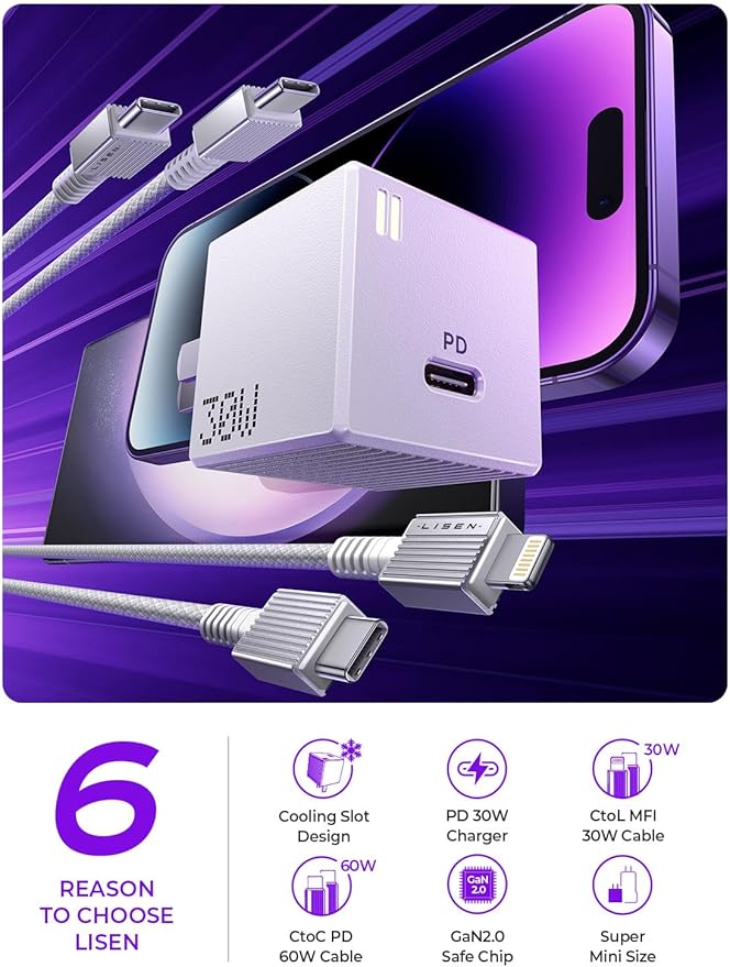 - COMPACT SIZE: Thanks to GaN technology, LISEN 30W PD power adapter is very compact and mini, smaller than the original iPhone 20W charger. You can easily put it into your backpack/handbag/pocket, it will be your best travel choice.