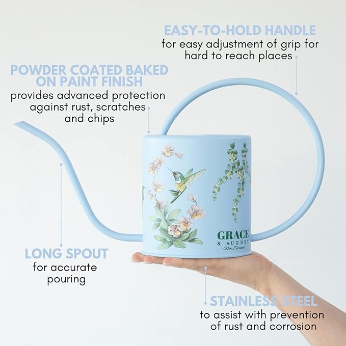 - 🪴 Artist design: This beautiful artwork was digitally designed and inspired by the elegance of Hummingbirds. Known for their beauty and grace, Hummingbirds deserve recognition, and we’ve captured their charm with stunning artwork. These designs are printed onto our watering cans and available in three delightful colors—sage green, light blue, and black. By bringing this art into your home, you can enjoy its beauty every day while nurturing your plants.