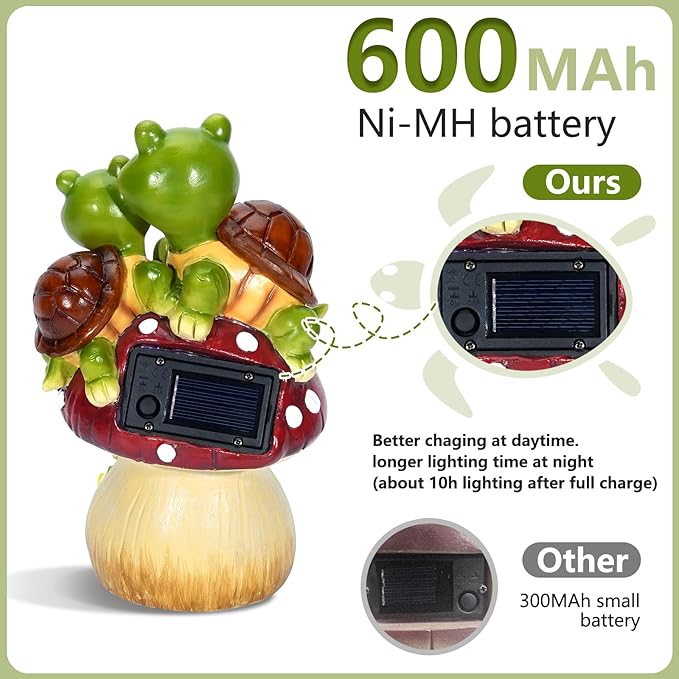• Solar Light Garden Statue: Our cute turtle mushroom statue will decorate your yard not only during the daytime, but also at night. 1.2V AAA 600mAH Ni-MH Battery - runs about 10 hours on a full charge of sunlight.