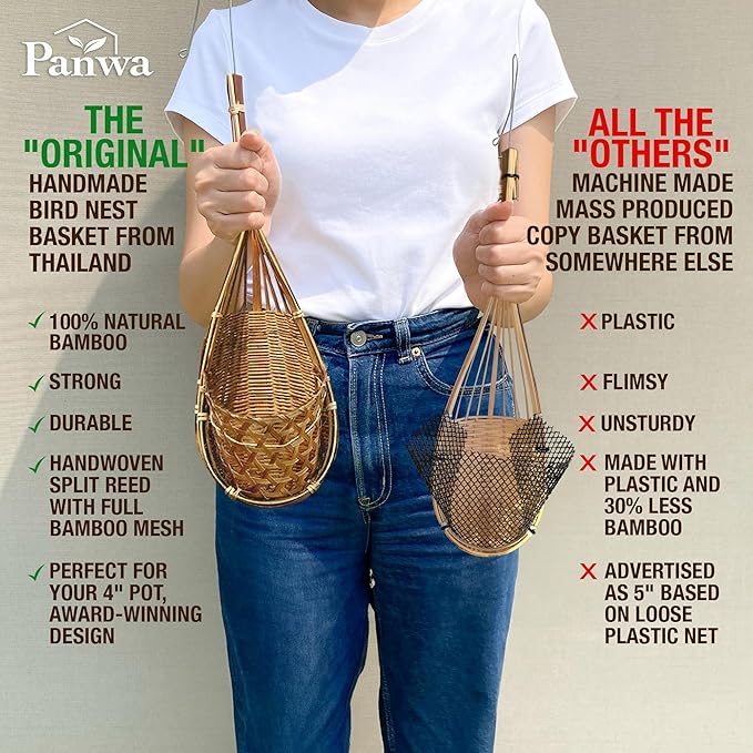 - π± TOTALLY UNIQUE: Handcrafted in the Northeastern villages of Thailand, these style of hanging baskets are beautifully designed for both form and function. The dark natural wood color is created from soaking the reeds and allowing them to dry. This time honored process is essential as it naturally finishes the baskets appearance.
