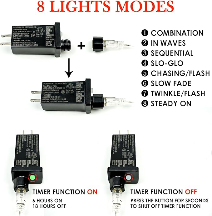 - Convenient Timer Function & 8 Modes & Memory Function: The button is at the end of the plug to turn on/off the timer function, press the button for few seconds till the green light on/off to turn on/off the timer function and switch 8 modes (combination, in waves, sequential, slo glo, chasing/flash, slow fade, twinkle/flash, steady on). This fairy lights could remember the setting of previous night you set.