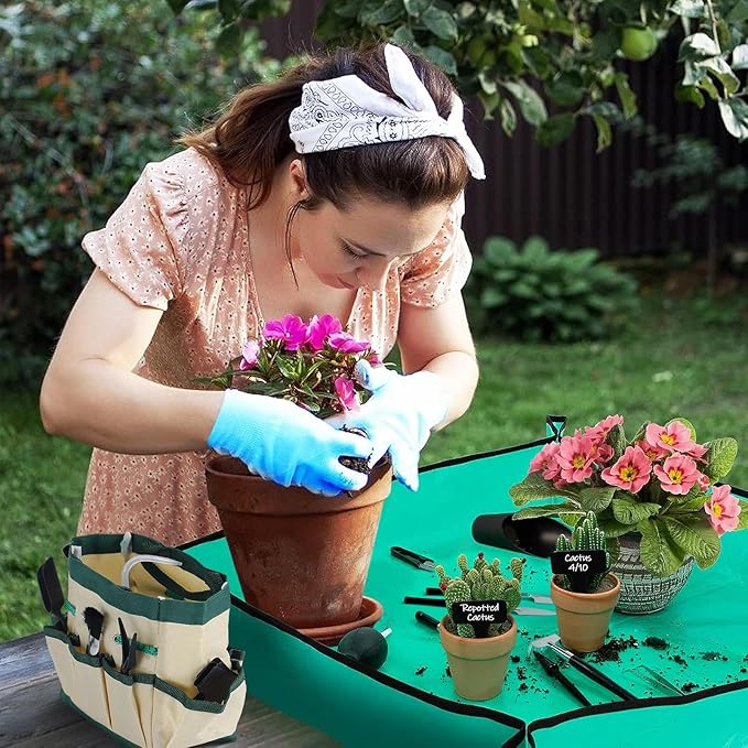 44 pcs Succulent Tool Set - 39.4" Indoor Plant Repotting Mat and 19 Pcs Mini Gardening Hand Tools Bag, Garden Plants Transplanting Supplies for Women Gardener Gifts Outdoor, Green