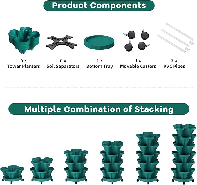 - 6 Tier Vertical Planter - 6 tier stacking planter, made of BPA-free material, can hold up to 24 different plants, such as strawberries, spinach, leaf lettuce, arugula, and mustard greens, and a few smaller herbs and flowers. Plus, it's the perfect vessel for strawberries as the berries cascade over the container lip.