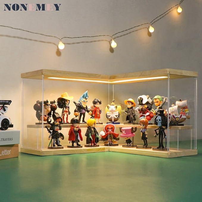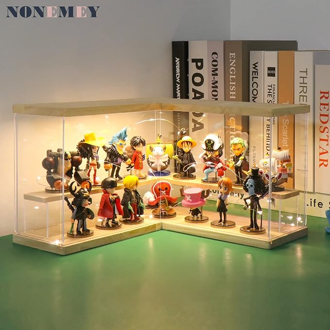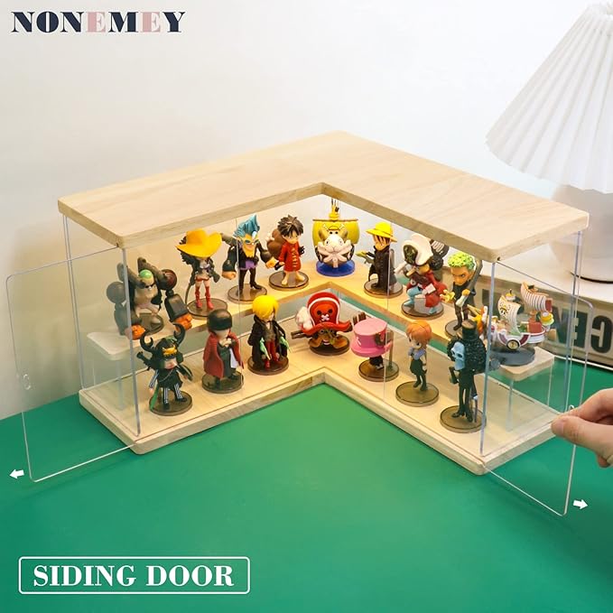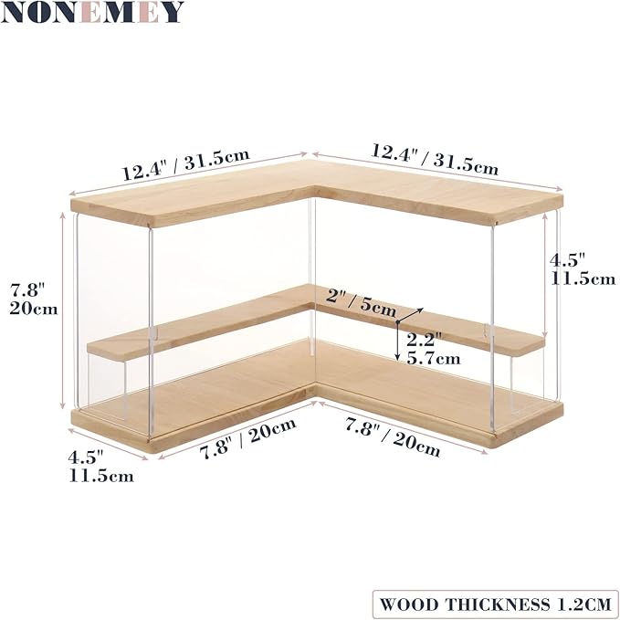 NONEMEY Clear Acrylic Display Case Stand with Wood Base 2/3/4/5/6 Tier Storage Box Showcase Dustproof Organizer Box for Collectibles (2Tier L Shape)