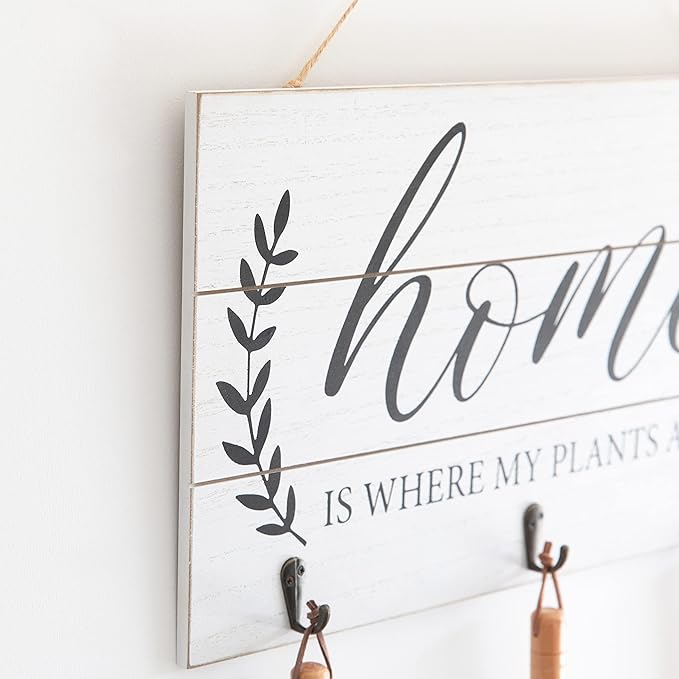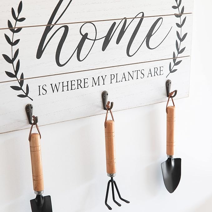 COLLECTIVE HOME - Garden Decor with Tools, Inspirational Wood Hanging Signs, Garden Tools Set - 3 Piece, Out Door Decor with Hooks, Home is Where My Plants are, 15.75"x9.5" (White)