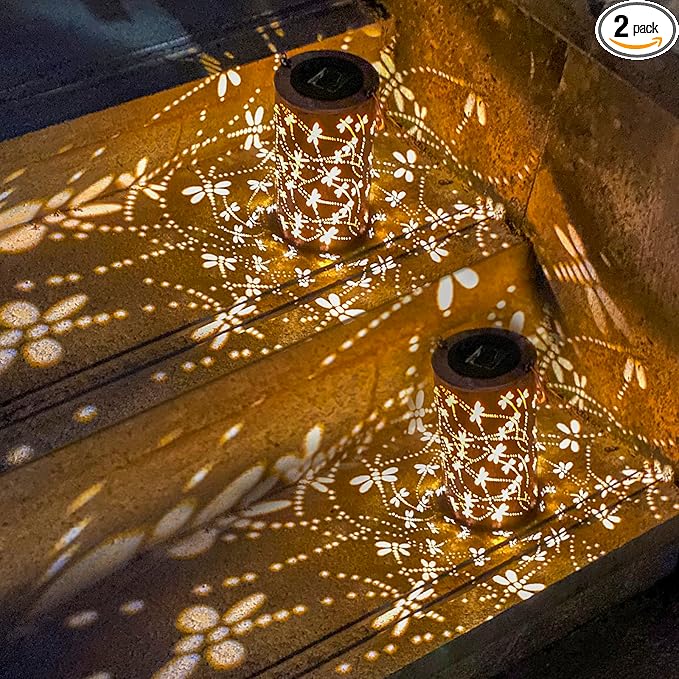 - Gorgeous & imaginative Garden Decor - Fusion the retro gold, copper of exteriors and irregular pattern inside, at darkness, the solar lantern casting a bright, warm light with dragonfly pattern, which looks like a dragonfly flying symbolizes change.