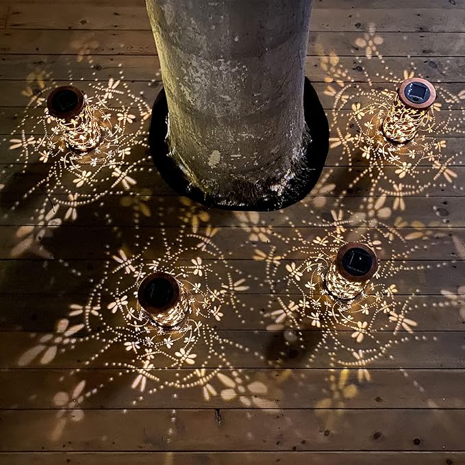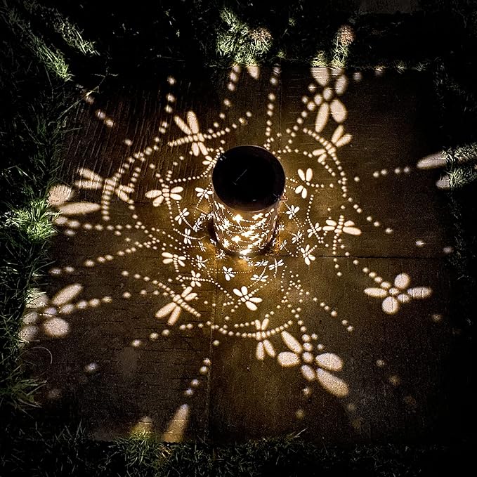 - Gorgeous & imaginative Garden Decor - Fusion the retro gold, copper of exteriors and irregular pattern inside, at darkness, the solar lantern casting a bright, warm light with dragonfly pattern, which looks like a dragonfly flying symbolizes change.