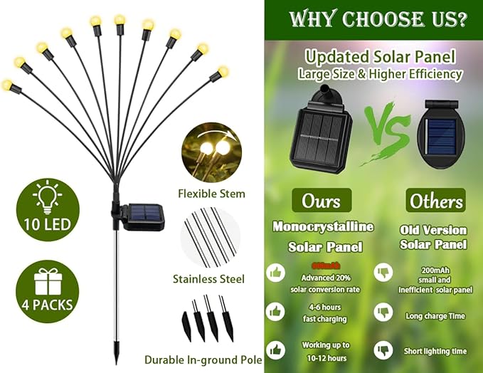 - 【Solar Powered Firefly Lights 】SunKite swaying solar lights made of very soft & flexible iron wires, updated 10 LED bulbs,more bigger and brighter than others.When the breeze blows, solar path lights sway with the wind, dance like fireflies in garden.