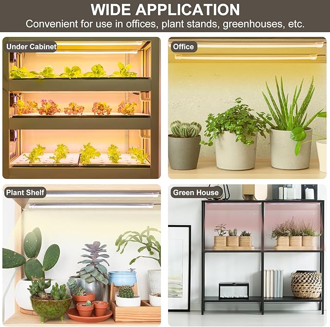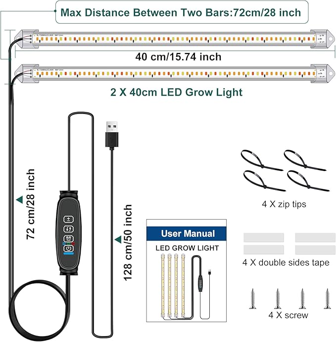 - [Easy & Flexible Installation]- The grow bar light come with 4 cable ties, 8 screws, 4 double-sided tape to provide 3 mounting options. You can use double-sided tape to stick to the surface or use the zip ties to fix the bars on the shelf or fix them with the screws. The power cord is 95 inches long for easy using in office,indoor,plant shelf,greenhouse etc.