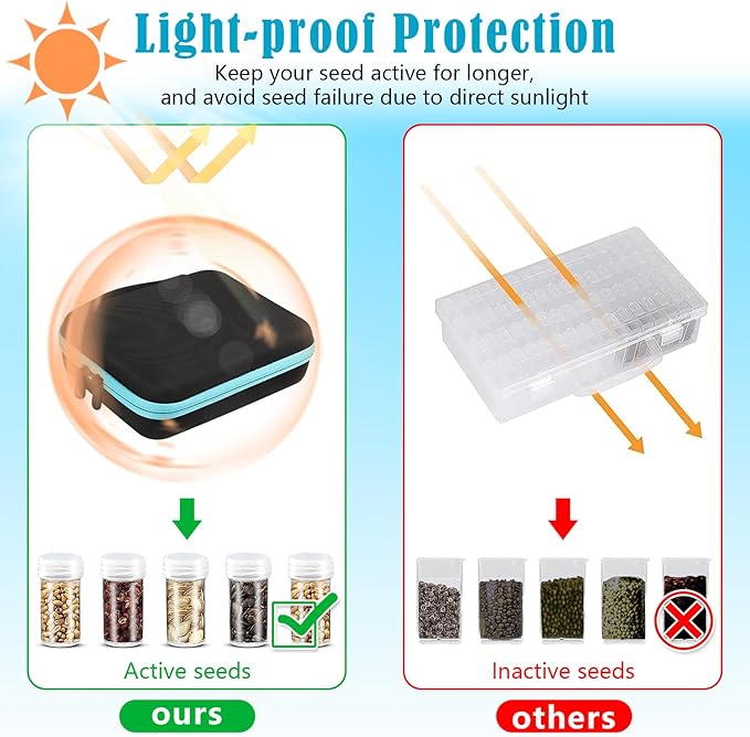 - Multiple Protection: All seed organizer boxes are seated securely in sponge holes to avoid collisions between boxes. Compared to large plastic boxes, the high-quality zipper bag can provide more cushioning and is not easily damaged. And seed organizer bag can provide light-proof protection, allowing them to maintain vitality for longer