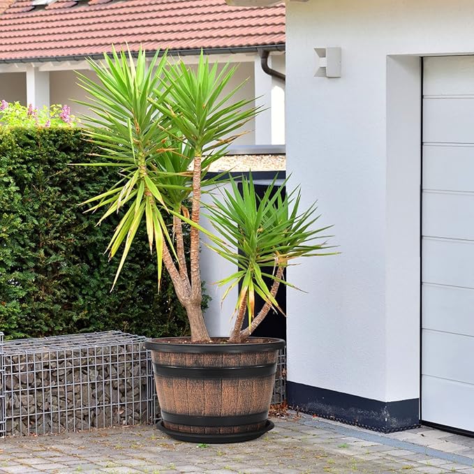Quarut Large Plastic 4 Pack14 inch Plant Pots,Whiskey Barrel Planters with Drainage Holes & Saucer.Flower Pots Imitation Wine Barrel Design for Indoor & Outdoor Garden Balcony Plants.5 Gallons(Brown)