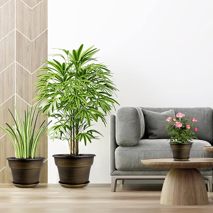 - 【TRADITIONAL DESIGN】Plastic planters for indoor plants with trays are designed in in dark gold colors & a classic look, which allow this pot to fit into any indoor & outdoor setting. With these golded flower pots, it could adds fresh, decorative flair to your home. Decorate your windowsill, desktop, shelf, bedroom, living room, kitchen, garden, office with our 13 inch large plastic plant pot.