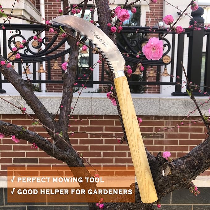SHANFEEK Grass Sickle with Sawtooth Japanese Weeding Hoe Weeding Tools for Garden High Toughness Stainless Steel with Hard Solid Wood Handle(Yellow)