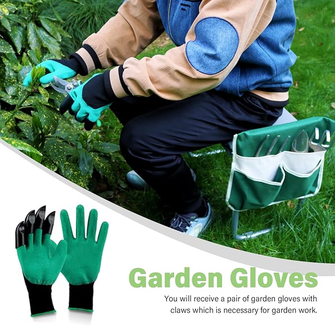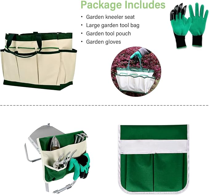 - What’s in the package - Includes a garden seat kneeler, tool pouch with velcro, a tool bag and a pair of groves. You can attach the tool pouch to your garden chair with Velcro, and have your gardening tools kit right by your side of gardening bench, wear garden gloves to protect your hands while working.