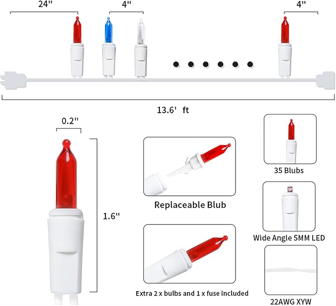 - 【Patriotic Mini String Lights Specification】: 1 Sets - white wire independence day string lights includes 35 count red white blue led lights, total length 13.6ft, lights length 11ft and each led is 4 inches apart, 24 inches lead wire, 4 inches end connector (Extra 2 x bulbs and 1 x fuse included)