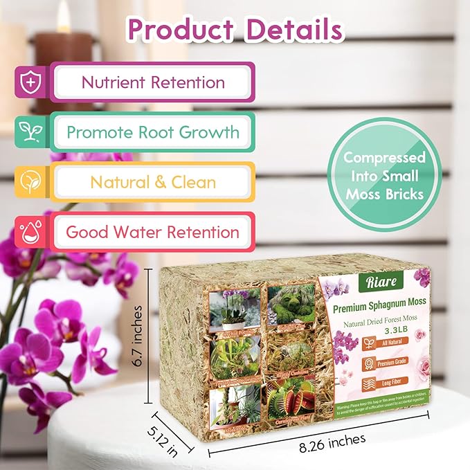 Riare 3.3 LB Premium Sphagnum Moss for Plants- 60QT Natural Long Fibered Sphagnum Peat Moss Plants Moss Dried, Carnivorous Plants Moss Orchid Potting Mix for Orchids, Carnivorous Plants, Succulent