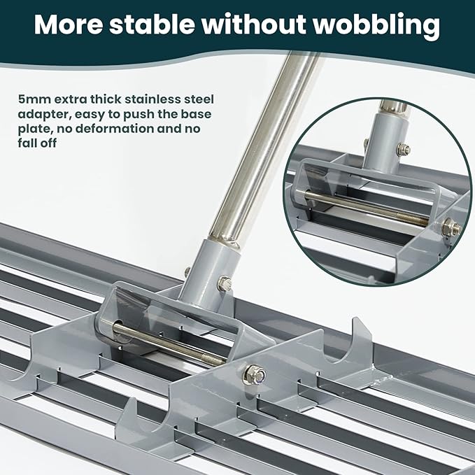 - 【Rugged and durable】Our Lawn Leveling Rake is built to last, with a rugged 2mm thick stainless steel bottom plate and reinforced handle that won't bend or break under pressure. Plus, with its ideal weight distribution, you won't have to worry about it tipping over or feeling too heavy. Whether you're tackling a large project or just need to maintain your lawn, our rake is up to the task.