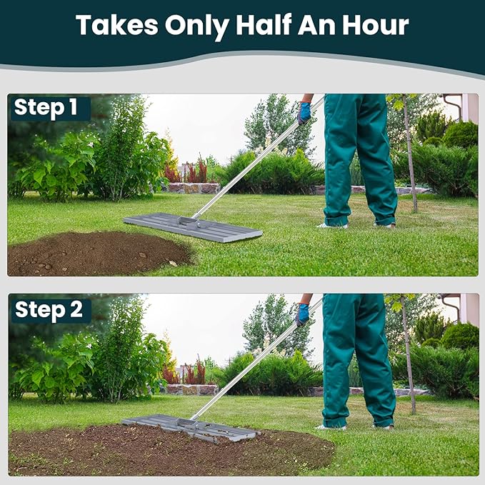 - 【Ergonomic design for comfortable use】Thanks to our improved curved handle design and ergonomic 72-inch handle length, you can comfortably use our Lawn Leveling Rake for hours without any discomfort. Our rake also features a durable and lightweight construction, making it easy to maneuver and control. In just half an hour, you can have your entire lawn leveled and looking its best.