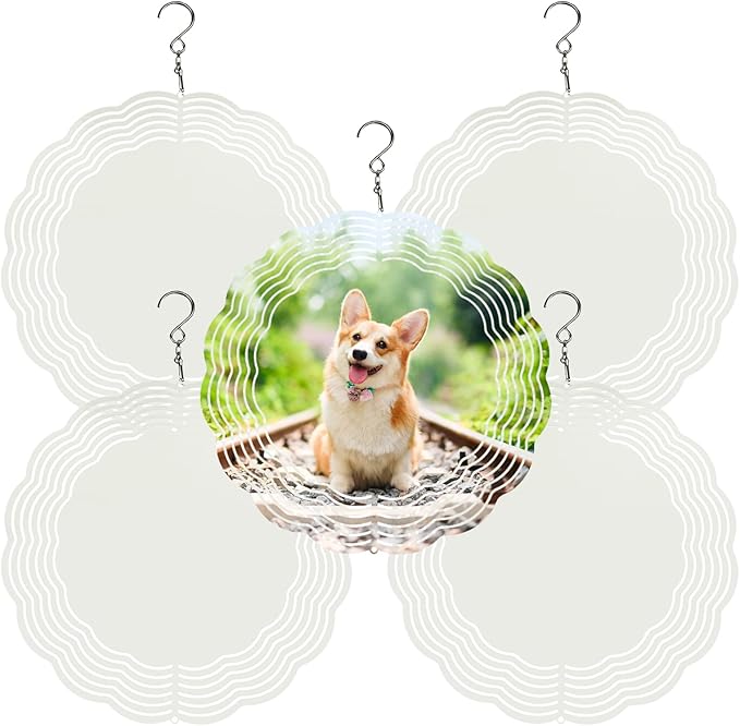 - 【Package Contents】You will get 5 pack of Sublimation Wind Spinner blanks and 5 hooks. The size of each Wind Spinner Blank is about 8 inches. These Wind Spinners can be used for double-sided sublimation and DIY your favorite patterns.