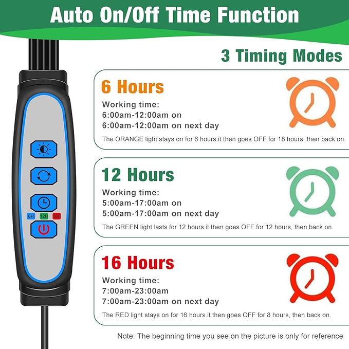 - [Upgraded Timer 6 12 16H] Most of the plant lights with built-in controllers on the market do not exceed the timed 12H, and ours has been upgraded to exceed 12H, which is more friendly to light-loving plants, so that the plants grow better. Set the timing time(6H 12H 16H), you don’t need to manually turn on and off the grow light. The grow light will convenient to takes good care of your plants when you go out to work or on vacation
