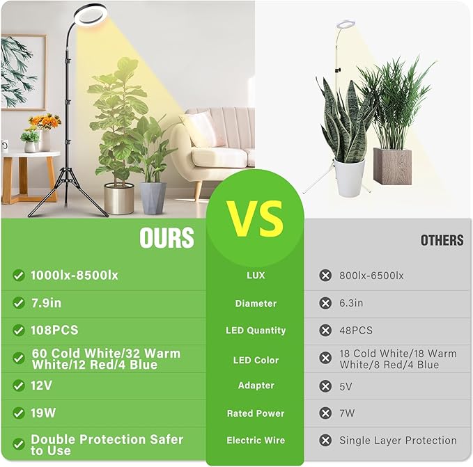 - 108 LEDs Full Spectrum Grow Light: Our plant light emits light including all wavelengths, from blue to red and even ultraviolet, ensuring your plants receive the nutrients they need at every growth stage. No more worries about insufficient sunlight, let them thrive in a cozy indoor environment. With 108 efficient LEDs, it also provides high LUMER & PAR to give your plants the perfect amount of light from seedlings to growth and flowering stages.