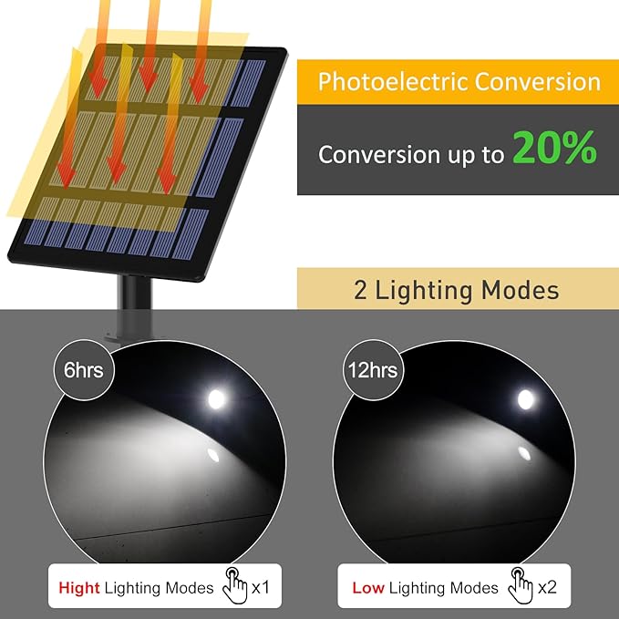 - 【4-in-1 Solar Spotlights】 Upgraded solar panel, holding the efficiency up to 20% conversion of solar energy. Providing more than 8-9 hours working after 6-8 hours fully charged.