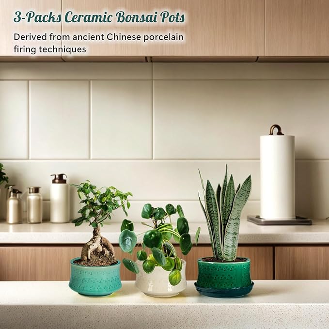 FFPOPU 3-Packs Ceramic Bonsai Pots with Drainage Tray, 6-inch Cute Bonsai Tree Pot with Ice Cracked Glaze, Small Bonsai Planter Pot for Desktop Decoration