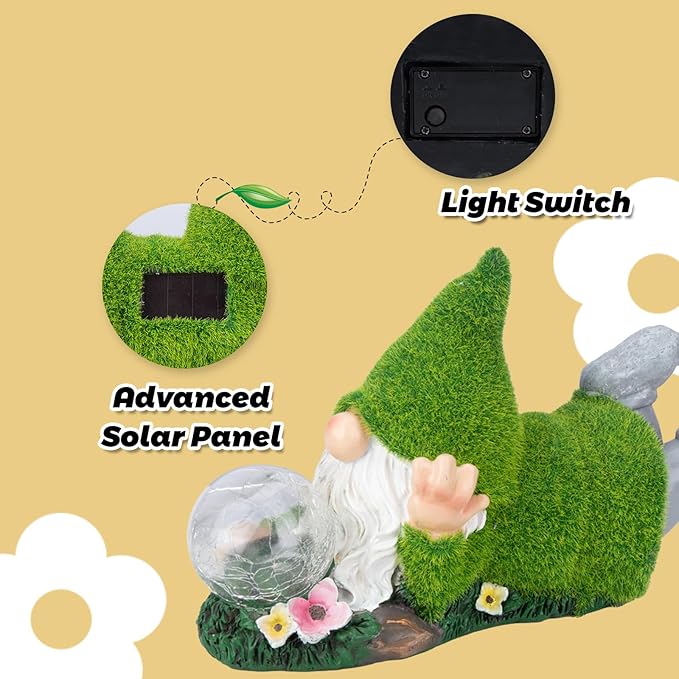 - 【Funny Garden Gnomes】 Flocked gnome lie on lawn and with crackle glass globe. This cute garden sculptures & statue is suitable for outdoor yard outside garden decorations