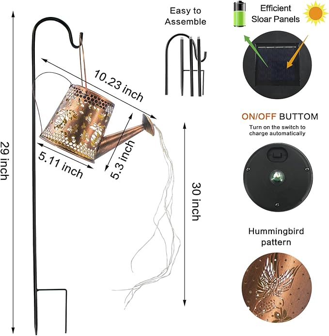 - 【Solar Watering Can With Lights】This solar outdoor lights is a unique and attractive outdoor decoration for gardens,vividly imitating the effect of flowing water.There are 6 copper string lights with a length of 25.9 inches (75 centimeters) and 42 ultra bright LEDs.The 32 inch shepherd hook attached to the solar waterfall lights is a perfect addition to garden decoration for your vines,potted plants,porch,path, terrace,and more.