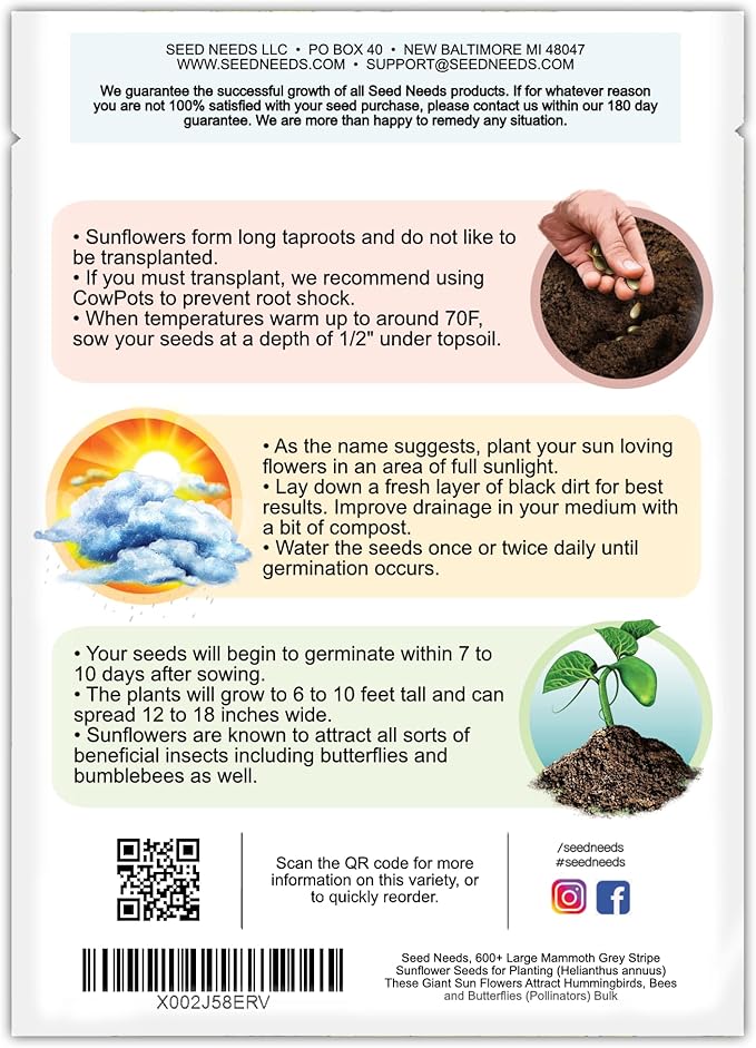 - Quality: All Mammoth Sunflower seeds packaged by Seed Needs are intended for the current and the following growing seasons. All seeds are stored in a temperature controlled facility that is free of significant amounts of moisture.