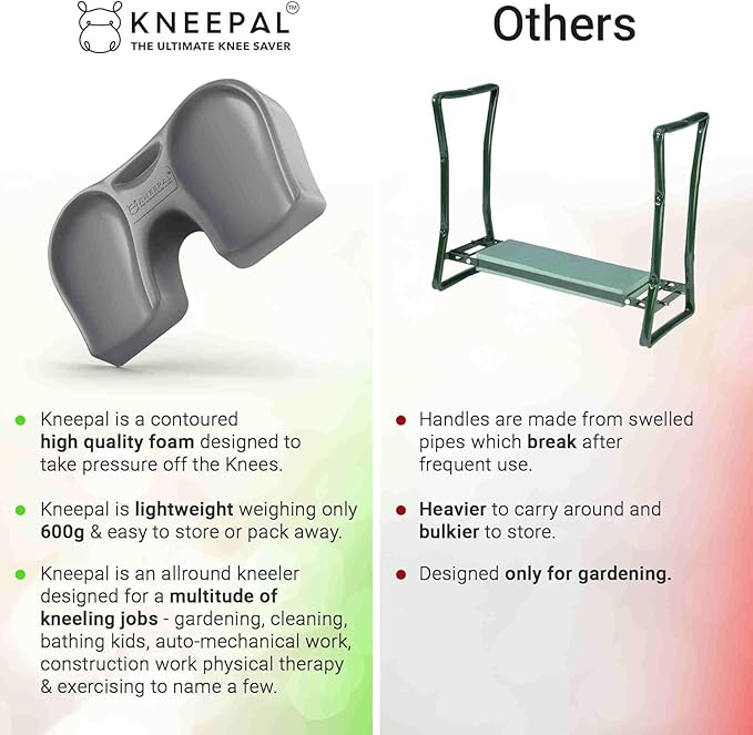 - LIGHTWEIGHT, PORTABLE DESIGN: Kneepal weighs less than 1.2lb making it easy and hassle-free to carry around making it popular as garden gifts; knee pads for women or knee pads for men.