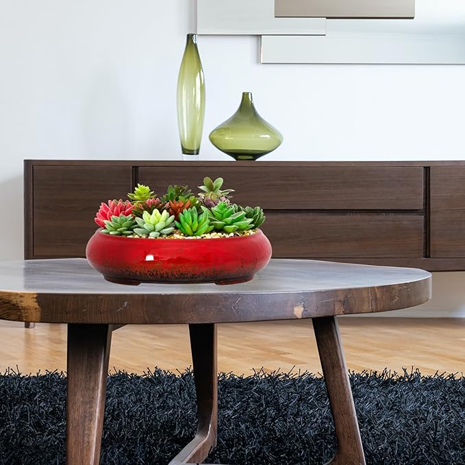 ARTKETTY Succulent Pots - 11.5 Inch Ceramic Bonsai Pots with Drainage, Large Shallow Succulent Planters for Indoor Outdoor Plants, Round Glazed Cactus Flower Plant Container Bowl Home Desk Decor(Red)