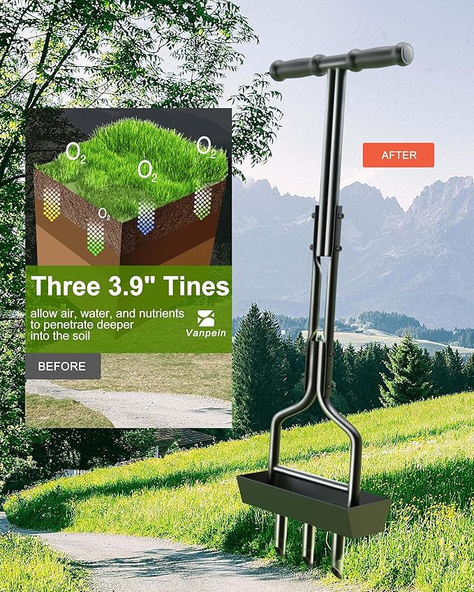 - 🌱 [3 Sharp Tines for Efficient Lawn Aerating] Yard grass aerators come with 3 sharp tines, the force of coring tines is maximized in the soil. Coring aerators require less effort to insert into compacted soil than semi-slotted hollow lawn aerators, which make lawn aeration smoother and more efficient. Full body painting make yard aeration tools durable and rust-proof. vanpein aeration tools help your lawn look better and refreshed.