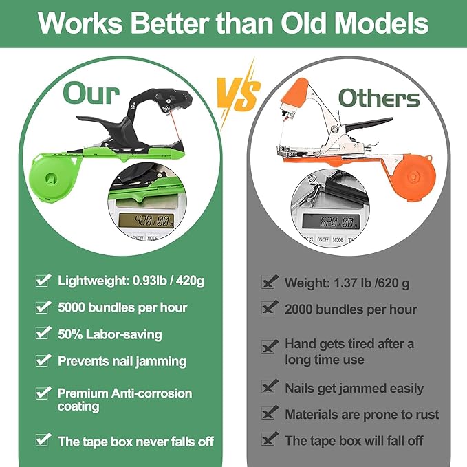 - Wider Jaw and Lightweight: This professional garden tape tool features a larger 50mm opening jaw. So It can also be widely used on thicker branches. Lighter than old model plant taping machines (Only 0.92lb). It works more efficenlty and can save 50% labor time.