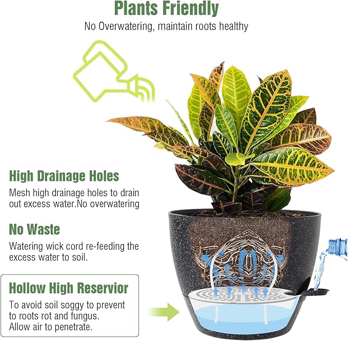- Self Watering Pots: Contains 3 different size combo of 12in, 10in, and 9in plastic plant pots with high drainage holes and deep reservoir for indoor outdoor gardening.