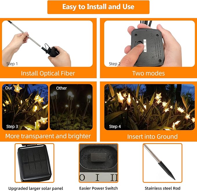 - ✅【Energy Saving and Easy to Install】: Solar firefly light is equipped with high-efficiency monocrystalline silicon solar panels, built-in 1.2V, 800mAh Ni-MH battery, ensuring your The solar outdoor lights are fast charging, it can be fully charged in 2-4 hours under direct sunlight, and can be continuously lit for 18-20 hours (continuously lit all night). No annoying wires to install, and you'll be doing all the quick installation steps in 10 seconds, lighting up your yard all night long!