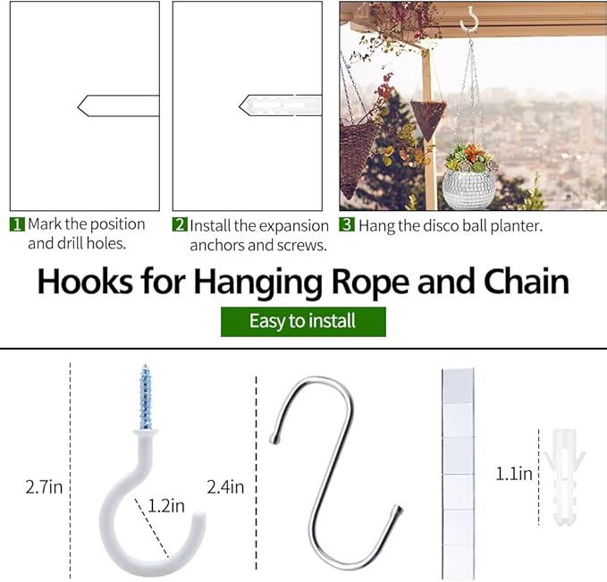 - Complete Set with Extra Mirror Pieces: Includes 1 silver 4-inch disco ball planter, 1 hanging rope, 1 hanging chain, 1 circle, 1 S-hook, 1 expansion anchor, 1 screw hook, and 6 extra mirror pieces for decorating.