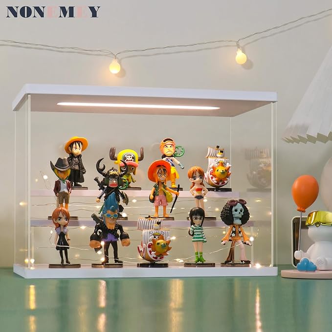 NONEMEY Clear Acrylic Display Case Stand with Led Light 2/3/4/5/6 Tier Storage Box Showcase Dustproof Organizer Box for Collectibles (White 3Tier 12.4*7*9inch)