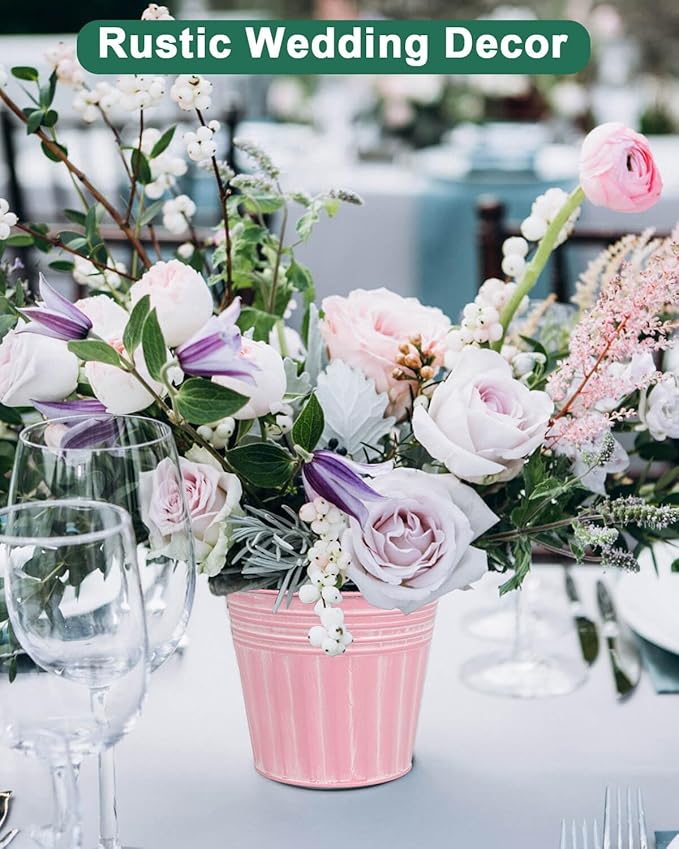vensovo 5 Inches Pink Metal Rustic Flower Pots - 6 Pcs Small Galvanized Planters with Drainage Hole and Rubber Plug, Rustproof Tin Bucket Plant Pot Farmhouse Vintage Style for Decor