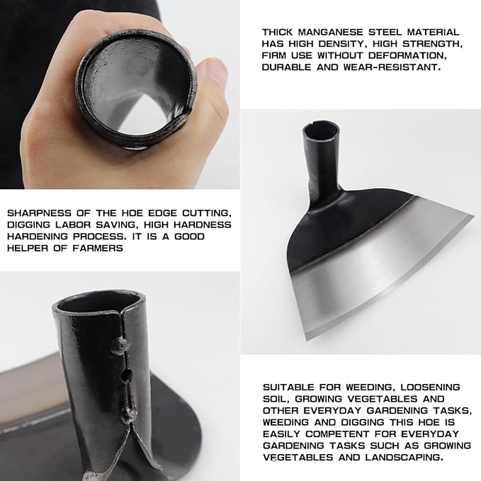 - Multi-Purpose Gardening Tool: The weeding hoe, planting hoe, and loosening hoe are versatile multi-purpose gardening tools. They can be used for planting vegetables, loosening soil, and landscaping gardens, nurseries, orchards, yards, and lawns. This sturdy hoe gardening tool accessory comes without a handle for individual use.