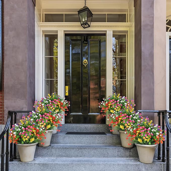 - Perfect for Outdoor/Indoor - Plastic flowers are ideal for outdoor porches,walkway,terraces,window box,front yard,pots,hanging planters,gardens,landscape,windowsills,allow you have beautiful color all year around.Also suit for birthdays,weddings,Memorial place or grave,they can live anywhere,and have withstood heavy rain storms and winds