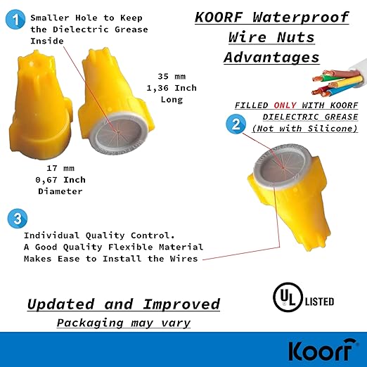 - ✔ UL LISTED & AFFORDABLE 50 PACK, DIELECTRIC GREASE FILLED: Easy-to-use waterproof wire connectors 25 Pack filled with premium KOORF dielectric grease, others products came filled with “Silicone Grease”, “Silicone Sealant” or even only “Silicone” with low-quality sealant, in few weeks that type of sealant will be evaporated or hardened leaving your connectors and wires open to a possible shortcut with all the risks, we only use our own KOORF Dielectric Grease to fill our products.