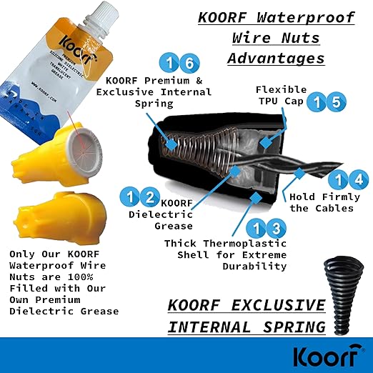 - ✔ EXCLUSIVE INTERNAL SPRING by KOORF: All and only our KOORF waterproof wire nuts include our EXCLUSIVE internal spring, longer with a specific patented shape to hold the wire in the best and safest way, do not play with the safety in electrical jobs using cheap electrical connectors. KOORF low voltage wire connectors can be used as automotive wire connectors, 2-wire connectors, 3-wire connectors, and bullet connectors. Premium electric connectors for wiring.