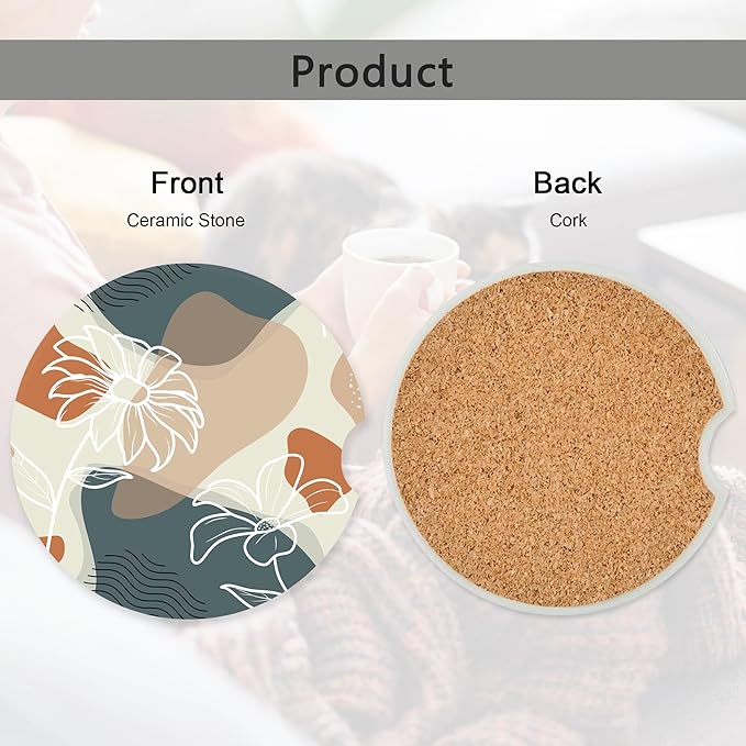 Abstract Flowers Leave Car Coasters,Ceramic Absorbent Cup Holders with Finger Notch & Cork Base Car Assecories for Women/Men 2.6"(2 Pieces)