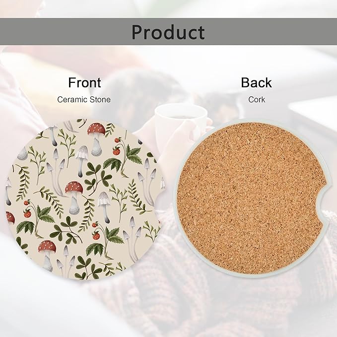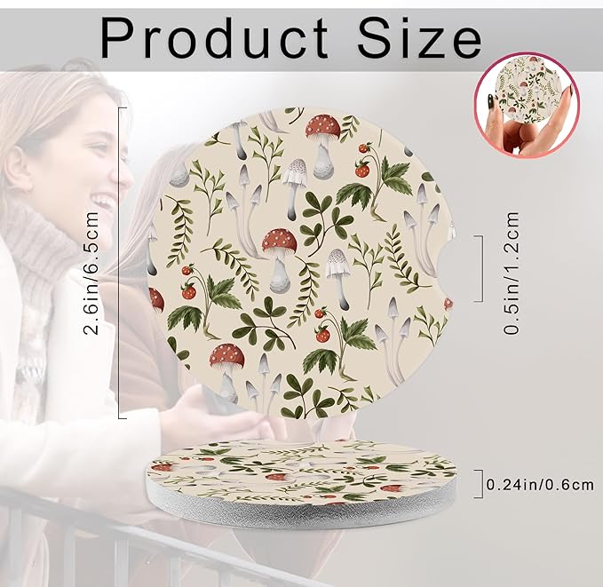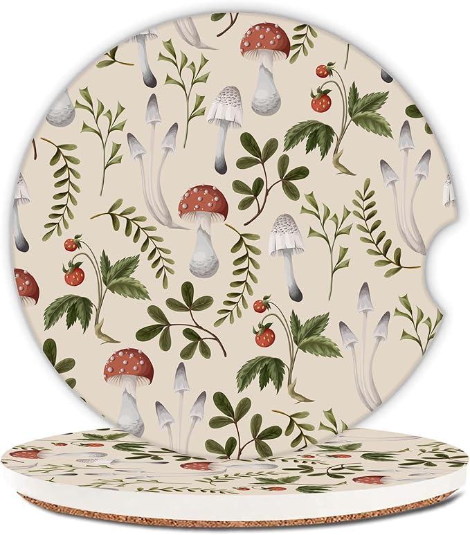 Vintage Mushroom Strawberry Car Coasters,Ceramic Absorbent Cup Holders with Finger Notch & Cork Base Car Assecories for Women/Men 2.6"(2 Pieces)