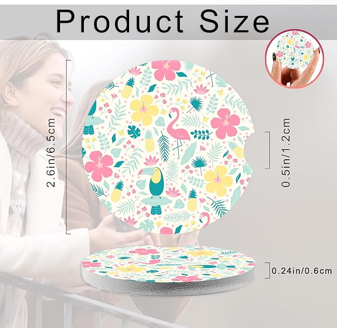 Tropical Flamingo Hibiscus Pineapple Car Coasters,Ceramic Absorbent Cup Holders with Finger Notch & Cork Base Car Assecories for Women/Men 2.6"(2 Pieces)