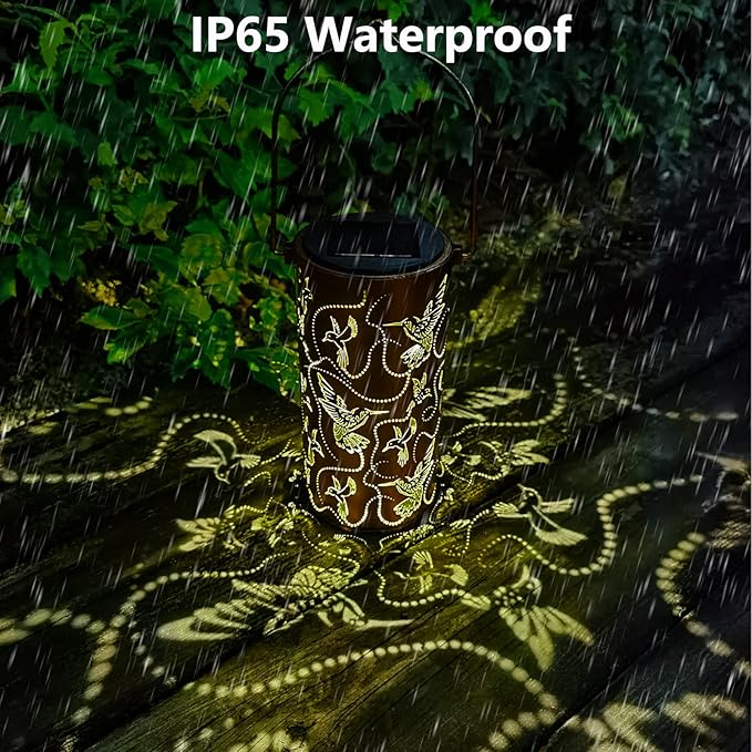 - Graceful Decorative Design - The retro appearance, with gold copper color and hollow out metal veneer, the solar outdoor lanterns casts bright and warm light in darkness, accompanied by gorgeous and graceful hummingbirds patterns, adding a beautiful atmosphere to the surrounding environment.