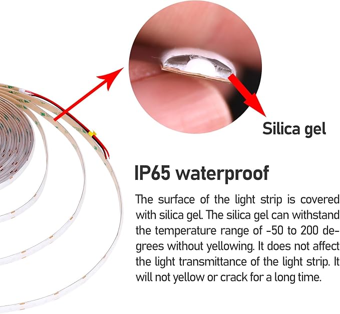 - 【IP65 Waterproof】IP65 waterproof LED strip is covered with a layer of silicone, if you need to weld, use your fingers to remove the silicone from the soldering point before welding.